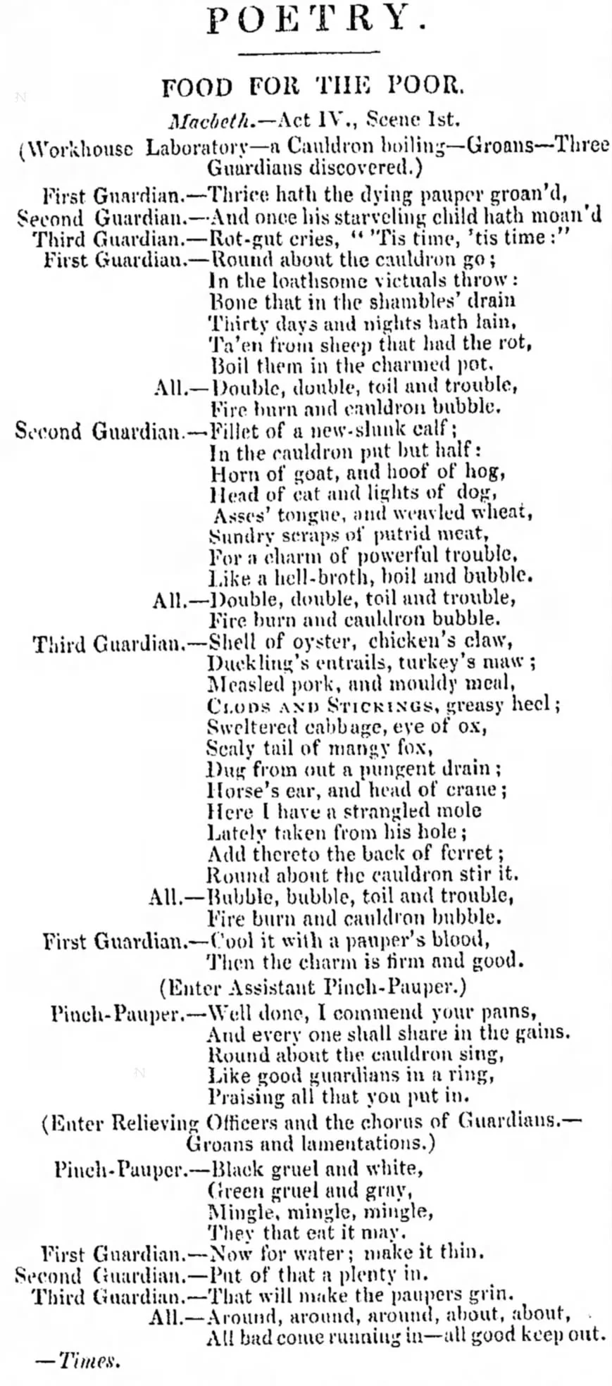 Also from that Workhouse video, I promised to share the complete article from the 1838 newspapers. This article used a variation on Act IV, Scene i of Macbeth to illustrate the horrendous state of the food served to inmates. Here it is: