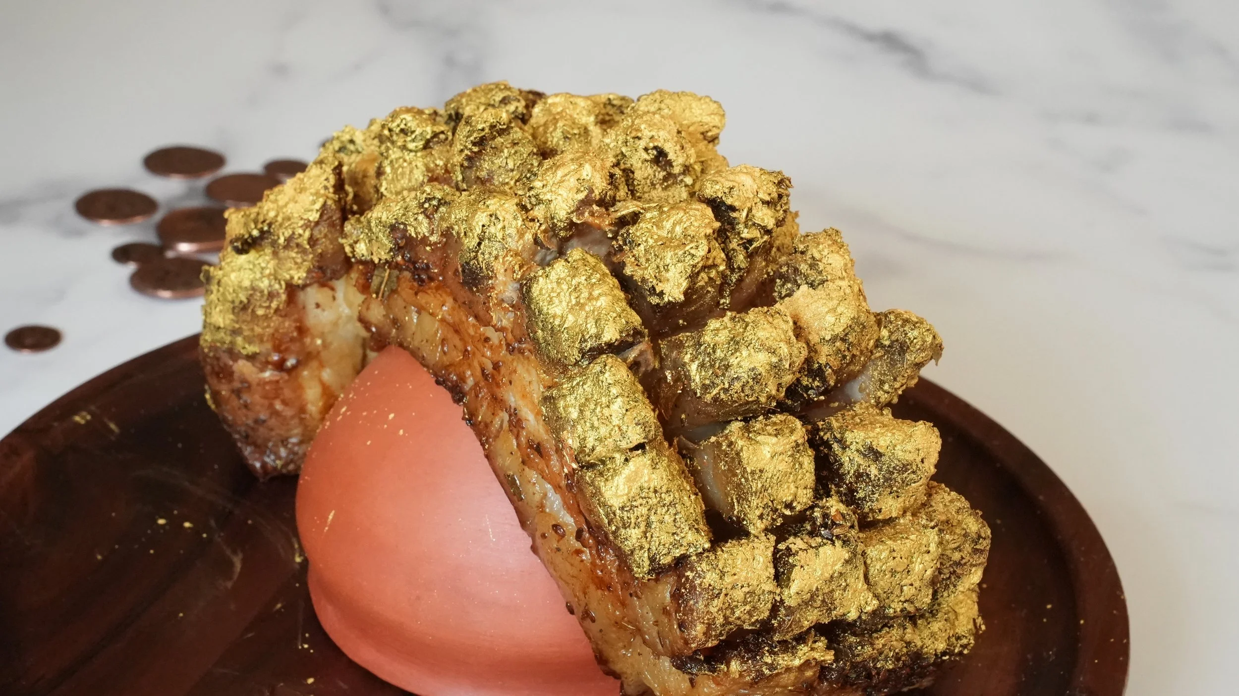 Skin-on marinated and roasted pork belly decorated with edible gold paint